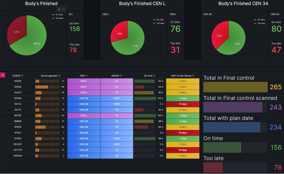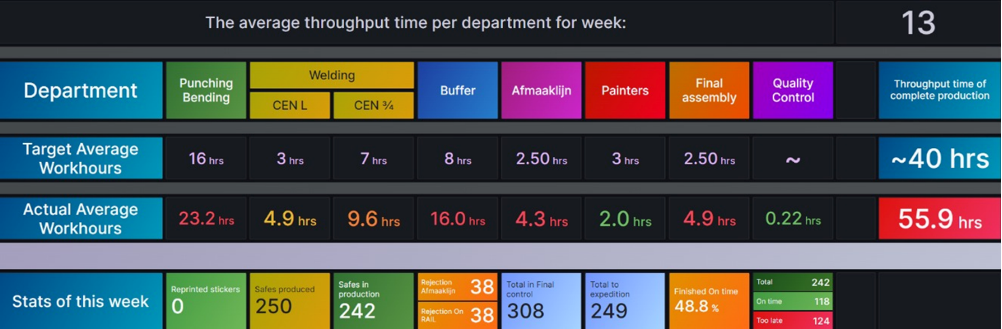 Realtime productie-inzicht gecreëerd met visuele dashboards die afdelingen en productieleiding helpen sneller bij te sturen, WIP te verlagen en leverbetrouwbaarheid te verhogen.